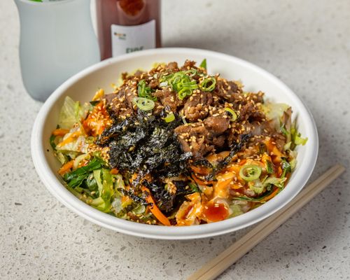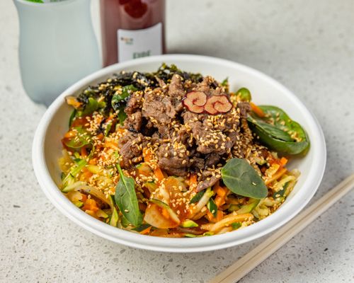 Base: Steamed Rice Vege: Baby Spinach, Carrot Namul, Zucchini Namul, Onion Namul, Mushroom Namul, Radish Sengchae Sauce: Classic Gochujang, Sesame Oil Protein: Bulgogi Beef Garnish: Sesame Seeds, Seaweed Flakes, Dried Dates