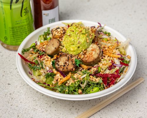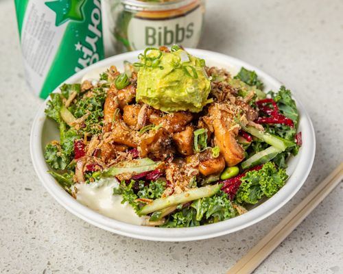 Base: Black Rice Vege: Kale, Beets, Cucumber, Avocado, Edamame Sauce: Garlic Soy, Yuzu Sour Cream Protein: Korean BBQ Chicken Garnish: Crispy Shallots, Spring Onion