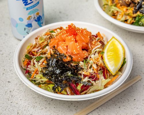 Base: Steamed Rice Vege: Lettuce, Cabbage, Perilla Leaves, Beets, Carrots, Bean Sprouts Sauce: Classic Gochujang, Sesame Oil Protein: Fresh Salmon Garnish: Sesame Seeds, Seaweed Flakes, Bean Powder, Flying Fish Roe