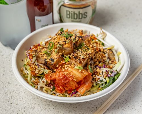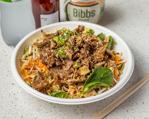 Base: Sweet Potato Glass Noodle Vege: Carrot Namul, Zucchini Namul, Mushroom Namul, Bean Sprouts, Baby Spinach Sauce: Garlic Soy, Sesame Oil Protein: Korean BBQ Pork Scotch Garnish: Crispy Shallots, Sesame Seeds, Spring Onion